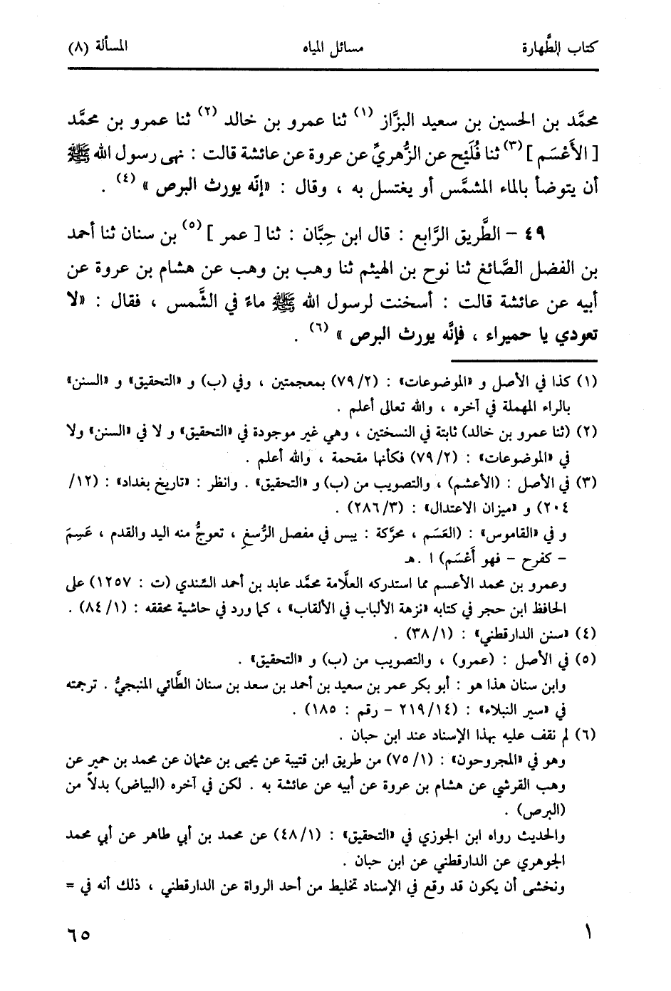 49 - الطَّريق الرَّابع: قال ابن حِبَّان: ثنا [عمر] (5) بن سنان ثنا أحمد بن الفضل الصَّائغ ثنا نوح بن الهيثم ثنا وهب بن وهب عن هشام بن عروة عن أبيه عن عائشة قالت: أسخنت لرسول الله صَلَّى اللَّهُ عَلَيْهِ وَسَلَّمَ ماءً في الشَّمس، فقال: "لا تعودي يا حميراء، فإنَّه يورث البرص" (6).