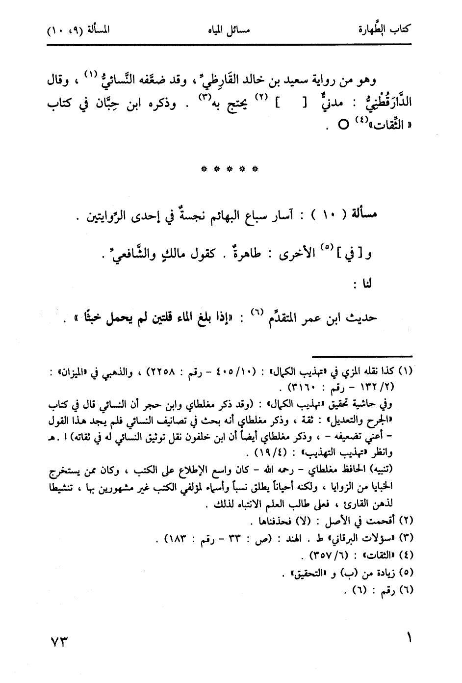 حديث ابن عمر المتقدم (6): " إذا بلغ الماء قلتين لم يحمل خبثاً ".