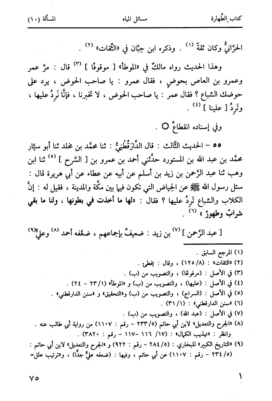 55 - الحديث الثَالث: قال الدَارَقُطْنيُ: ثنا محمَّد بن مخلد ثنا أبو سيَّار محمَّد بن عبد الله بن المستورد حدثني أحمد بن عمرو بن [السَّرح] (5) ثنا ابن وهب ثنا عبد الرَحمن بن زيد بن أسلم عن أبيه عن عطاء عن أبي هريرة قال: سئل رسول الله صَلَّى اللَّهُ عَلَيْهِ وَسَلَّمَ عن الحِياض التي تكون فيما بين مكَّة والمدينة، فقيل له: إنَّ الكلاب والسباع تَرِدُ عليها؟ فقال: "لها ما أخذت في بطونها، ولنا ما بقي شرابٌ وطهورٌ " (6).
