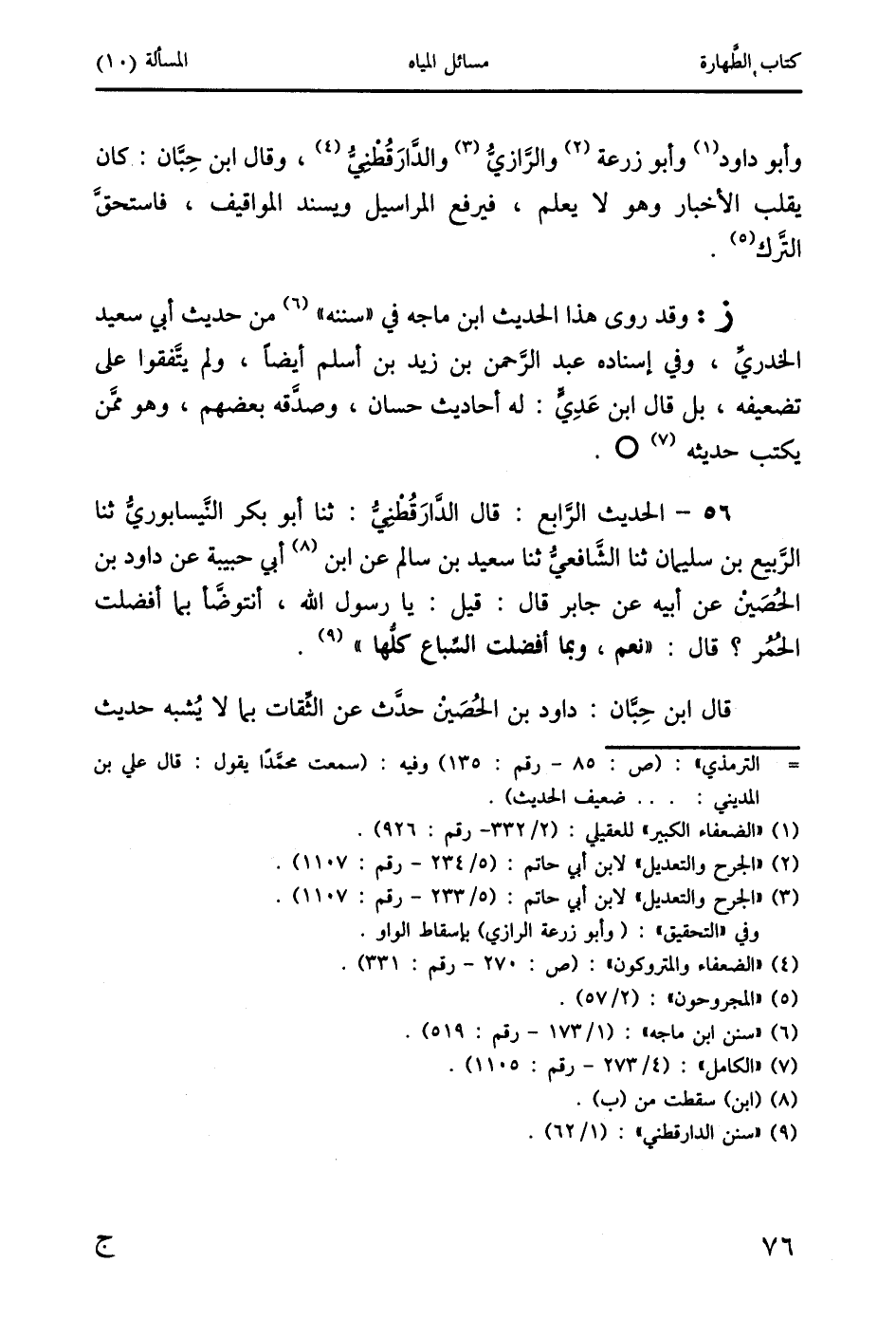 56 - الحديث الرَابع: قال الدارَقُطنيُ: ثنا أبو بكر النَيسابوريَّ ثنا الرَبيع بن سليمان ثنا الشَافعيُ ثنا سعيد بن سالم عن ابن (8) أبي حبيبة عن داود بن الحُصَين عن أبيه عن جابر قال: قيل: يا رسول الله، أنتوضَأ بما أفضلت الحُمُر؟ قال: "نعم، وبما أفضلت السَّباع كلها " (9).
