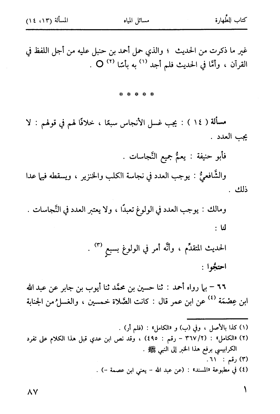 66 - بما رواه أحمد: ثنا حسين بن محمَّد ثنا أيوب بن جابر عن عبد الله ابن عِصْمَة (4) عن ابن عمر قال: كانت الصَلاة خمسين، والغسلُ من الجنابة