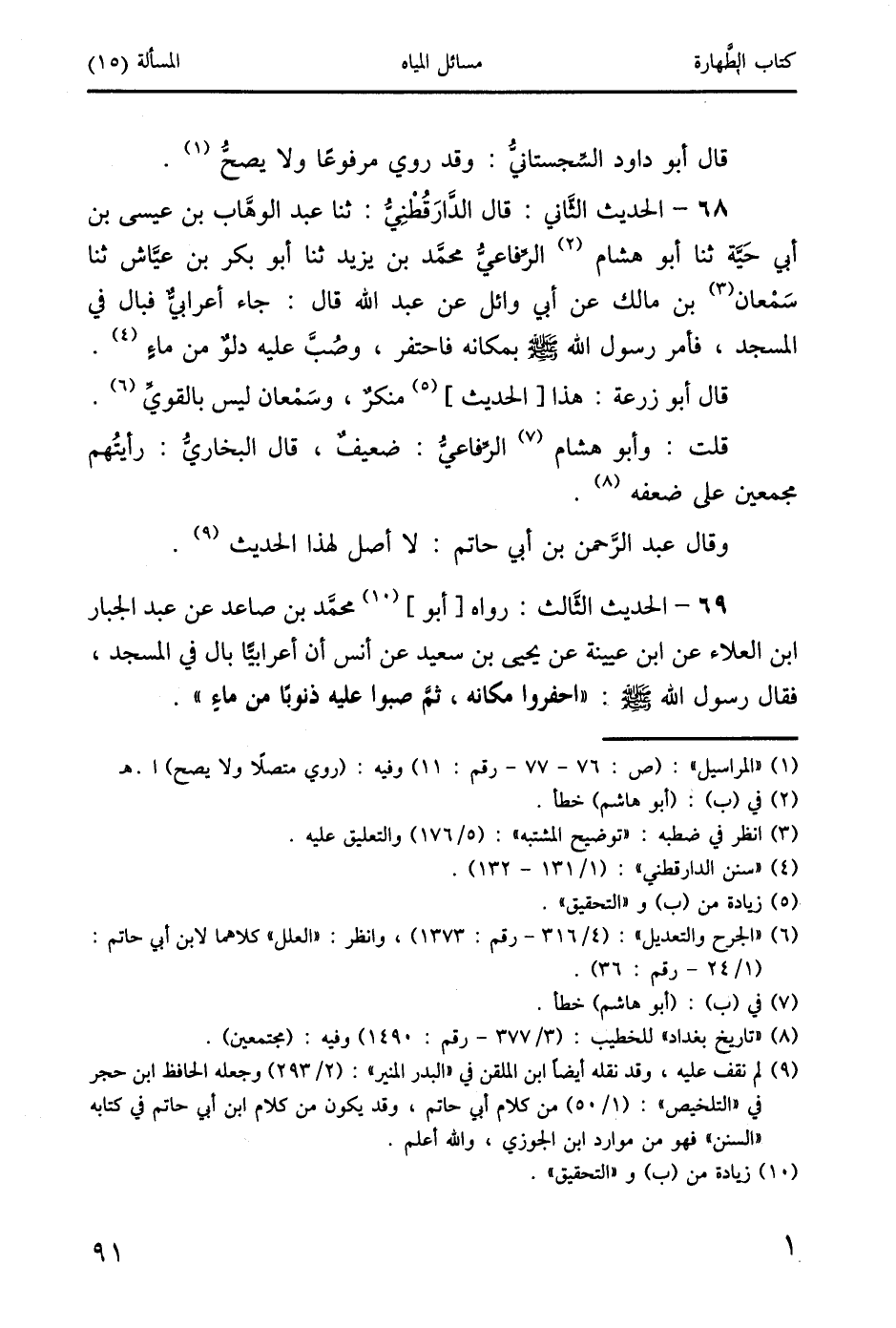68 - الحديث الثَاني: قال الدَارَقُطْنِيُ: ثنا عبد الوهَّاب بن عيسى بن أبي حَيَّة ثنا أبو هشام (2) الرَّفاعيُ محمَّد بن يزيد ثنا أبو بكر بن عيَّاش ثنا سَمْعان (3) بن مالك عن أبي وائل عن عبد الله قال: جاء أعرابيٌ فبال في المسجد، فأمر رسول الله صَلَّى اللَّهُ عَلَيْهِ وَسَلَّمَ بمكانه فاحتفر، وصُبَ عليه دلوٌ من ماءَ (4).