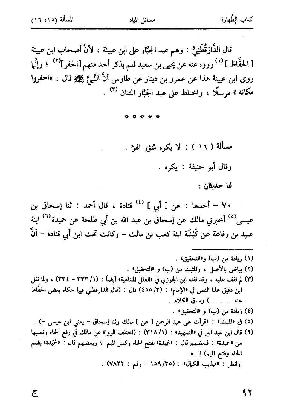 قال الدارَقُطْنيُ: وهم عبد الجبَار على ابن عيينة، لأنَ أصحاب ابن عيينة [الحفاظ] (1) رووه عنه عن يحيى بن سعيد فلم يذكر أحد منهم [الحفر] (2)؛ وإنَما روى ابن عيينة هذا عن عمرو بن دينار عن طاوس أنَ النَّبيَ صَلَّى اللَّهُ عَلَيْهِ وَسَلَّمَ قال: "احفروا مكانه " مرسلاً، واختلط على عبد الجبَار المتنان (3).