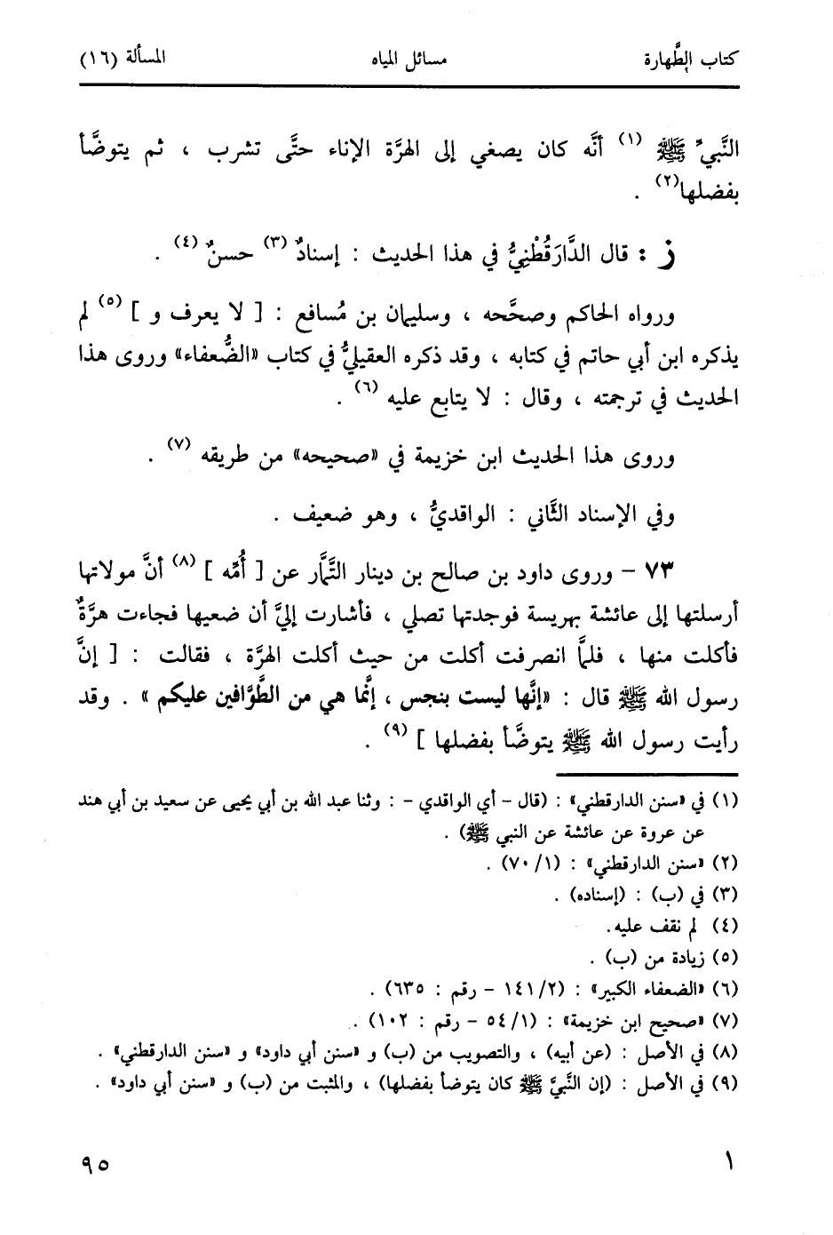 73 - وروى داود بن صالح بن دينار التَّمار عن [أُمه] (8) أنَّ مولاتها أرسلتها إلى عائشة بهريسة فوجدتها تصلي، فأشارت إليَّ أن ضعيها فجاءت هرَّة فأكلت منها، فلما انصرفت أكلت من حيث أكلت الهرَّة، فقالت: [إن رسول الله صَلَّى اللَّهُ عَلَيْهِ وَسَلَّمَ قال: "إنَّها ليست بنجس، إنَّما هي من الطَوافين عليكم ". وقد رأيت رسول الله صَلَّى اللَّهُ عَلَيْهِ وَسَلَّمَ يتوضأ بفضلها] (9).