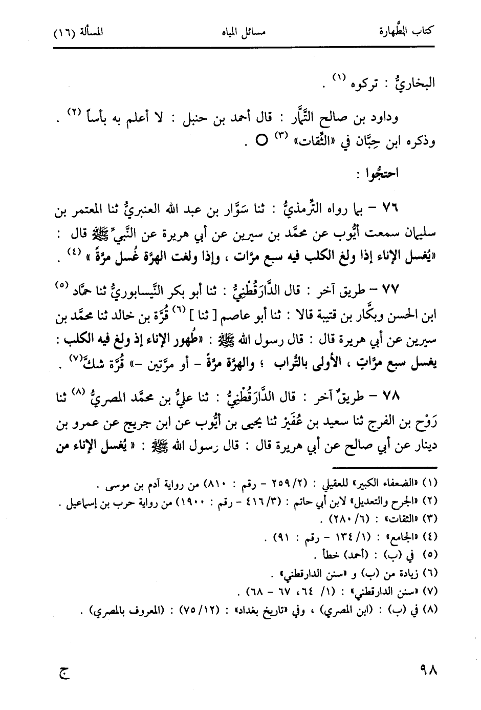 76 - بما رواه التِّرمذيُّ: ثنا سَوَّار بن عبد الله العنبريَّ ثنا المعتمر بن سليمان سمعت أيُوب عن محمَّد بن سيربن عن أبي هريرة عن النَبيِّ صَلَّى اللَّهُ عَلَيْهِ وَسَلَّمَ قال: "يُغسل الإناء إذا ولغ الكلب فيه سبع مرَّات، وإذا ولغت الهرة غُسل مرةً " (4).