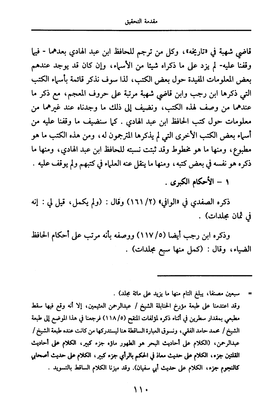 قاضي شهبة في "تاريخه"، وكل من ترجم للحافظ ابن عبد الهادي بعدهما - فيما وقفنا عليه - لم يزد على ما ذكراه شيئًا من الأسماء، وإن كان قد يوجد عندهم بعض المعلومات المفيدة حول بعض الكتب، لذا سوف نذكر قائمة بأسماء الكتب التي ذكرها ابن رجب وابن قاضي شهبة مرتبة على حروف المعجم، مع ذكر ما عندهما من وصف لهذه الكتب، ونضيف إلى ذلك ما وجدناه عند غيرهما من معلومات حول كتب الحافظ ابن عبد الهادي. كما سنضيف ما وقفنا عليه من أسماء بعض الكتب الأخرى التي لم يذكرها المترجمون له، ومن هذه الكتب ما هو مطبوع، ومنها ما هو مخطوط وقد ثبتت نسبته للحافظ ابن عبد الهادي، ومنها ما ذكره هو نفسه في بعض كتبه، ومنها ما ينقل عنه العلماء في كتبهم ولم يوقف عليه.