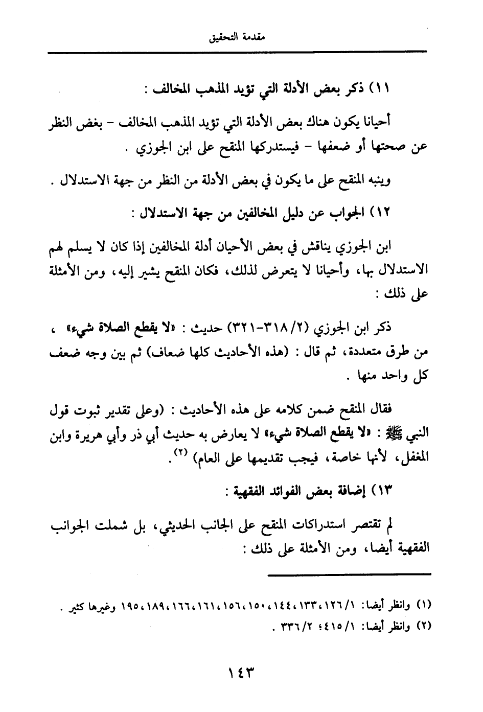 ابن الجوزي يناقش في بعض الأحيان أدلة المخالفين إذا كان لا يسلم لهم الاستدلال بها، وأحيانًا لا يتعرض لذلك، فكان المنقح يشير إليه، ومن الأمثلة على ذلك: