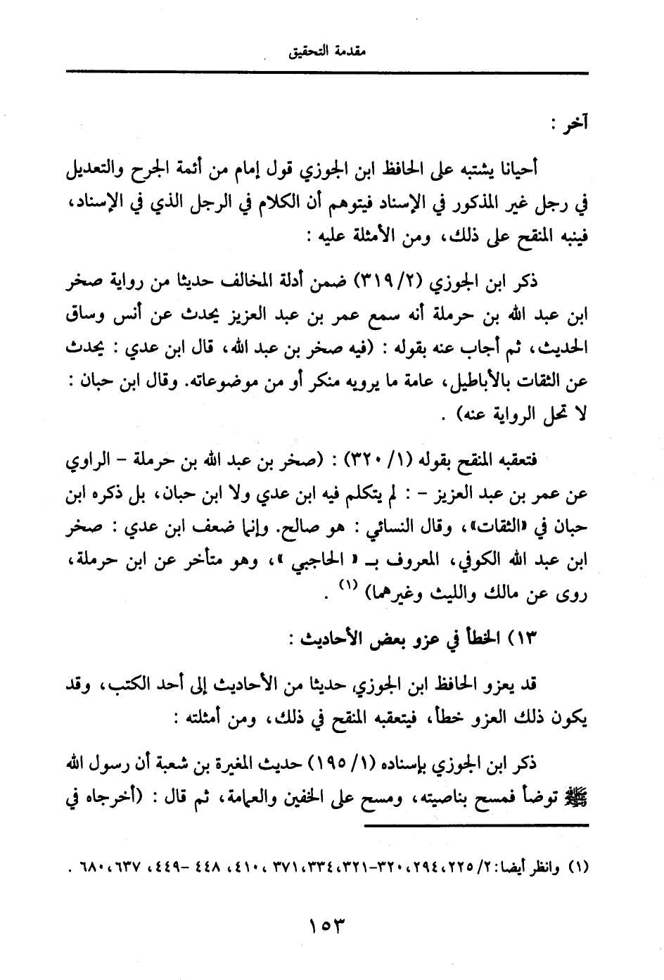 فتعقبه المنقح بقوله (1/ 320): (صخر بن عبد الله بن حرملة - الراوي عن عمر بن عبد العزيز -: لم يتكلم فيه ابن عدي ولا ابن حبان، بل ذكره ابن حبان في "الثقات"، وقال النسائي: هو صالح. وإنما ضعف ابن عدي: صخر ابن عبد الله الكوفي، المعروف بـ " الحاجبي "، وهو متأخر عن ابن حرملة، روى عن مالك والليث وغيرهما) (1).