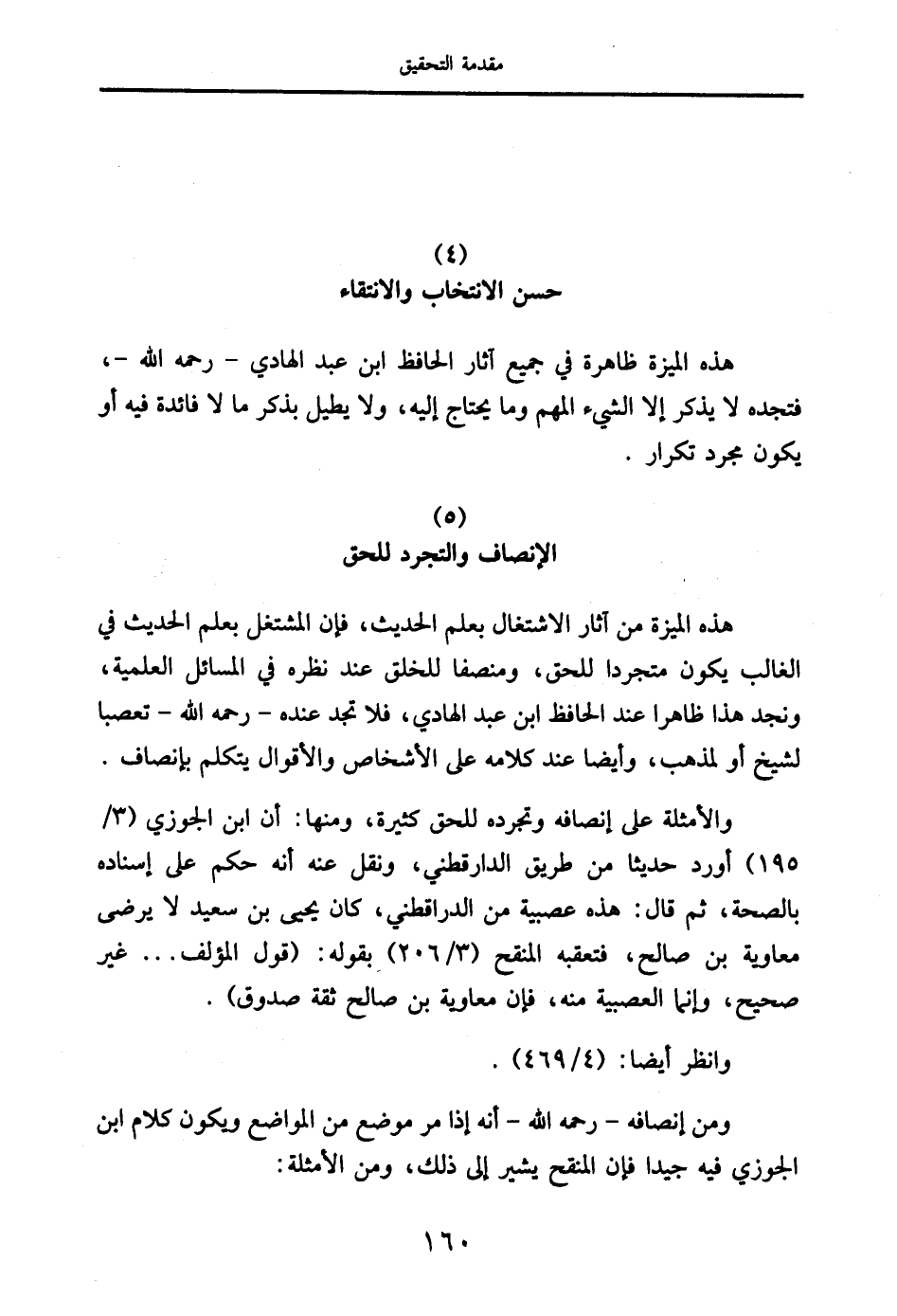والأمثلة على إنصافه وتجرده للحق كثيرة، ومنها: أن ابن الجوزي (3/ 195) أورد حديثًا من طريق الدارقطني، ونقل عنه أنه حكم على إسناده بالصحة، ثم قال: هذه عصبية من الدارقطني، كان يحيى بن سعيد لا يرضى معاوية بن صالح، فتعقبه المنقح (3/ 206) بقوله: (قول المؤلف ... غير صحيح، وإنما العصبية منه، فإن معاوية بن صالح ثقة صدوق).