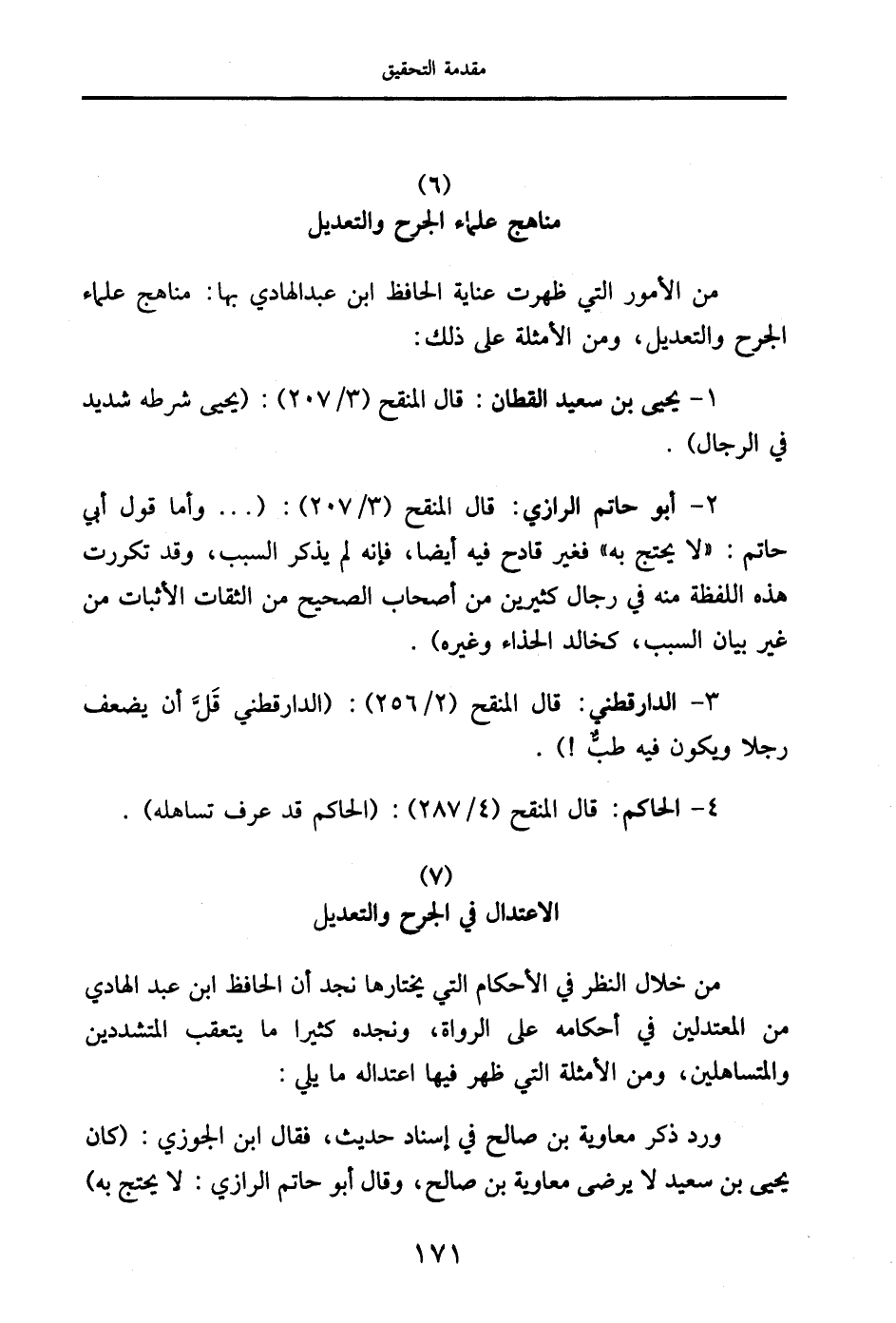 من الأمور التي ظهرت عناية الحافظ ابن عبد الهادي بها: مناهج علماء الجرح والتعديل، ومن الأمثلة على ذلك: