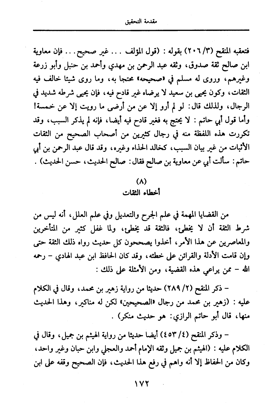 من القضايا المهمة في علم الجرح والتعديل وفي علم العلل، أنه ليس من شرط الثقة أن لا يخطئ، فالثقة قد يخطئ، ولما غفل كثير من المتأخرين والمعاصرين عن هذا الأمر، أخذوا يصححون كل حديث رواه ذلك الثقة حتى وإن قامت الأدلة والقرائن على خطئه، وقد كان الحافظ ابن عبد الهادي - رحمه الله - ممن يراعي هذه القضية، ومن الأمثلة على ذلك: