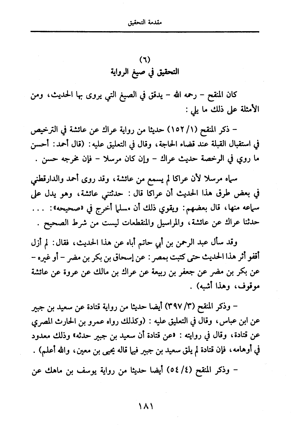 - ذكر المنقح (1/ 152) حديثًا من رواية عراك عن عائشة في الترخيص في استقبال القبلة عند قضاء الحاجة، وقال في التعليق عليه: (قال أحمد: أحسن ما روي في الرخصة حديث عراك - وإن كان مرسلاً - فإن مخرجه حسن.