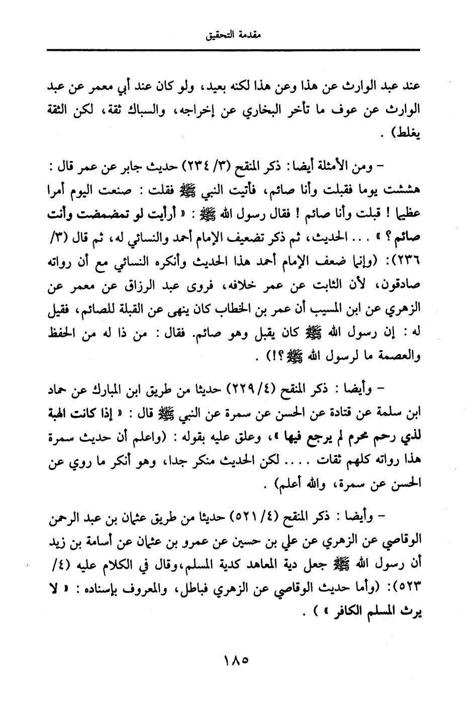 - وأيضًا: ذكر المنقح (4/ 521) حديثًا من طريق عثمان بن عبد الرحمن الوقاصي عن الزهري عن علي بن حسين عن عمرو بن عثمان عن أسامة بن زيد أن رسول الله صَلَّى اللَّهُ عَلَيْهِ وَسَلَّمَ جعل دية المعاهد كدية المسلم، وقال في الكلام عليه (4/ 523): (وأما حديث الوقاصي عن الزهري فباطل، والمعروف بإسناده: " لا يرث المسلم الكافر ").