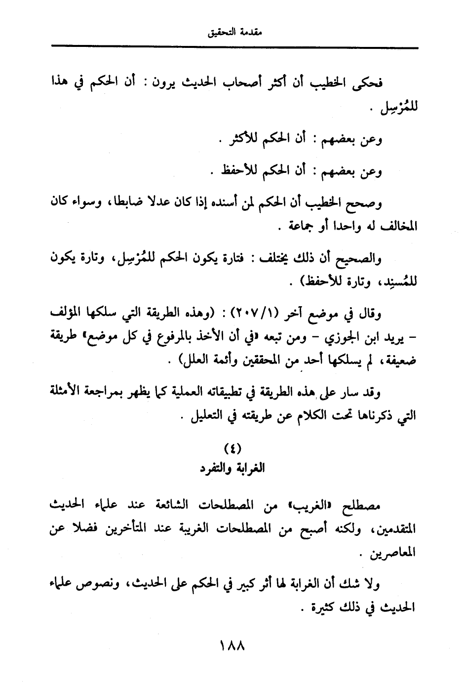 وقال في موضع آخر (1/ 207): (وهذه الطريقة التي سلكها المؤلف - يريد ابن الجوزي - ومن تبعه " في أن الأخذ بالمرفوع في كل موضع " طريقة ضعيفة، لم يسلكها أحد من المحققين وأئمة العلل).