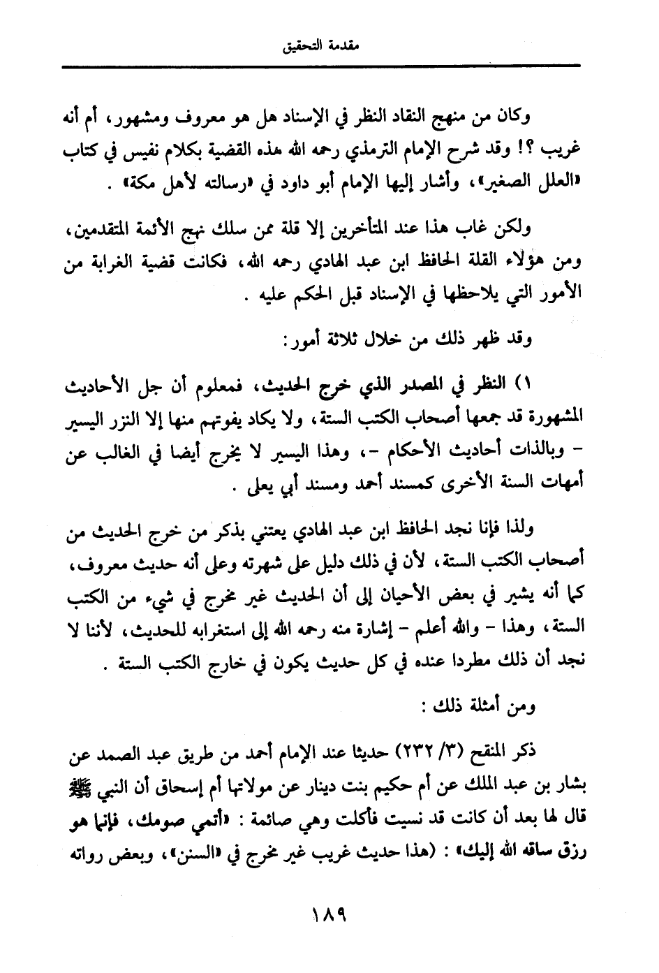 ولكن غاب هذا عند المتأخرين إلا قلة ممن سلك نهج الأئمة المتقدمين، ومن هؤلاء القلة الحافظ ابن عبد الهادي رحمه الله، فكانت قضية الغرابة من الأمور التي يلاحظها في الإسناد قبل الحكم عليه.
