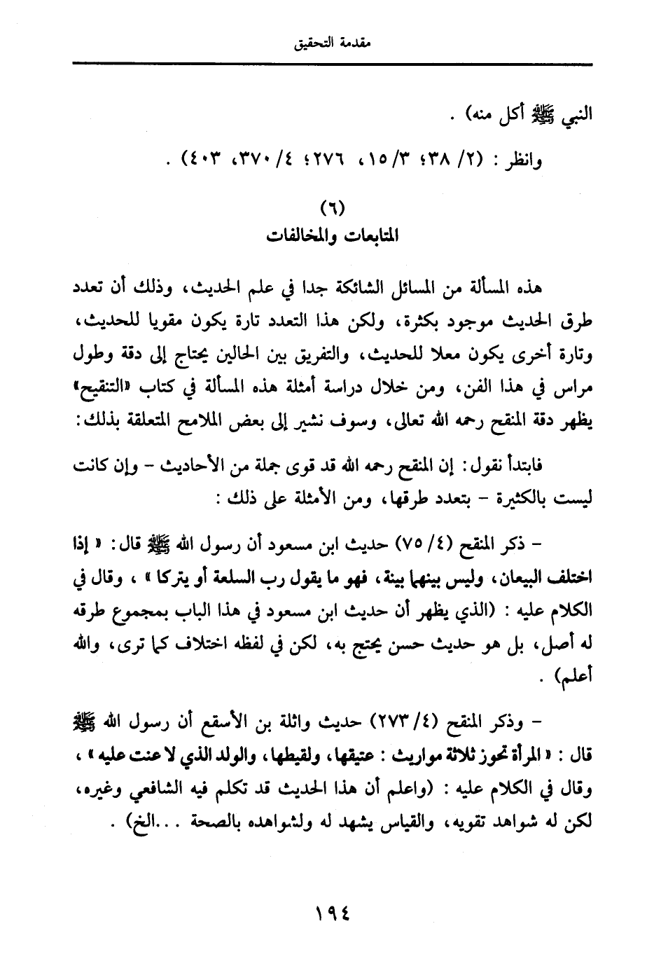 - وذكر المنقح (4/ 273) حديث واثلة بن الأسقع أن رسول الله صَلَّى اللَّهُ عَلَيْهِ وَسَلَّمَ قال: " المرأة تحوز ثلاثة مواريث: عتيقها، ولقيطها، والولد الذي لاعنت عليه "، وقال في الكلام عليه: (واعلم أن هذا الحديث قد تكلم فيه الشافعي وغيره، لكن له شواهد تقويه، والقياس يشهد له ولشواهده بالصحة ... الخ).