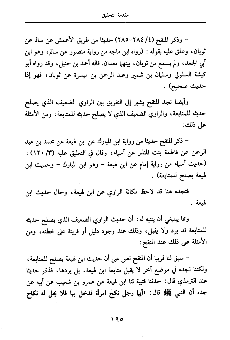 - ذكر المنقح حديثًا من رواية ابن المبارك عن ابن لهيعة عن محمد بن عبد الرحمن عن فاطمة بنت المنذر عن أسماء، وقال في التعليق عليه (3/ 120): (حديث أسماء من رواية إمام عن ابن لهيعة - وهو ابن المبارك - وحديث ابن لهيعة يصلح للمتابعة).