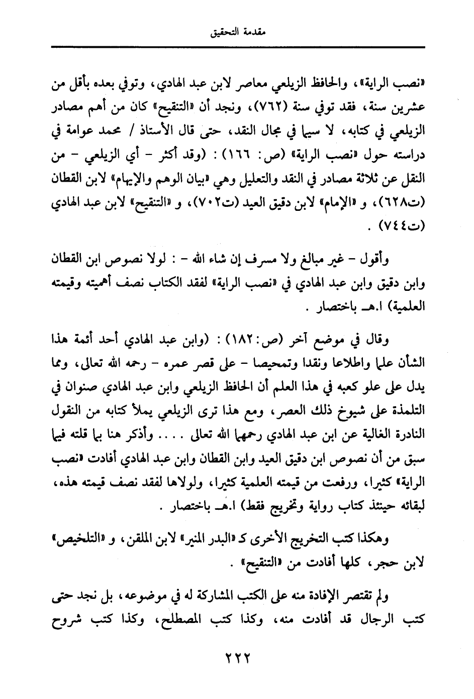 وقال في موضع آخر (ص: 182): (وابن عبد الهادي أحد أئمة هذا الشأن علمًا واطلاعًا ونقدًا وتمحيصًا - على قصر عمره - رحمه الله تعالى، ومما يدل على علو كعبه في هذا العلم أن الحافظ الزيلعي وابن عبد الهادي صنوان في التلمذة على شيوخ ذلك العصر، ومع هذا ترى الزيلعي يملأ كتابه من النقول النادرة الغالية عن ابن عبد الهادي رحمهما الله تعالى .... وأذكر هنا بما قلته فيما سبق من أن نصوص ابن دقيق العيد وابن القطان وابن عبد الهادي أفادت "نصب الراية" كثيرًا، ورفعت من قيمته العلمية كثيرًا، ولولاها لفقد نصف قيمته هذه، لبقائه حينئذ كتاب رواية وتخريج فقط) ا. هـ باختصار.