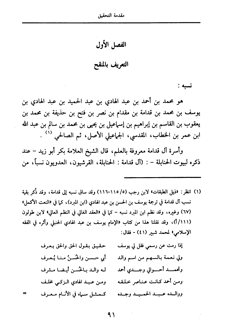 (1) انظر: " ذيل الطبقات " لابن رجب (5/ 115 - 116) وقد ساق نسبه إلى قدامة، وقد ذُكر بقية نسب آل قدامة في ترجمة يوسف بن الحسن بن عبد الهادي (ابن المبرد)، كما في " النعت الأكمل " (67) وغيره، وقد نظم ابن المبرد نسبه - كما في " العقد الغالي في النظم العالي " لابن طولون (111/أ)، وقد نقلنا هذا من كتاب " الإمام يوسف بن عبد الهادي الحنبلي وأثره في الفقه الإسلامي " لمحمد شبير (41) - فقال: