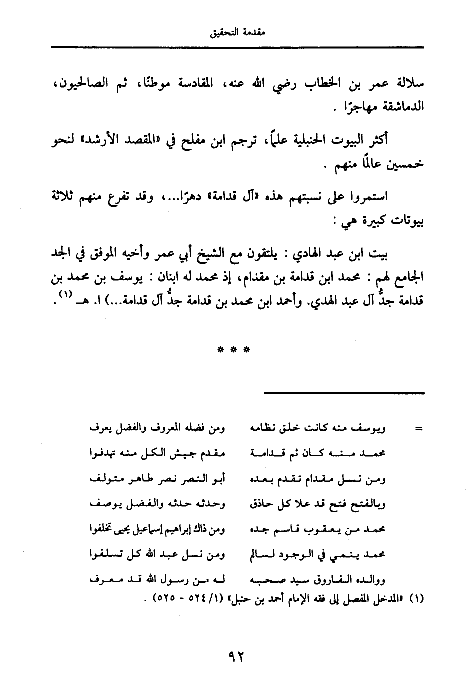 بيت ابن عبد الهادي: يلتقون مع الشيخ أبي عمر وأخيه الموفق في الجد الجامع لهم: محمد ابن قدامة بن مقدام، إذ محمد له ابنان: يوسف بن محمد بن قدامة جدُّ آل عبد الهادي. وأحمد ابن محمد بن قدامة جدُّ آل قدامة ...) ا. هـ (1).