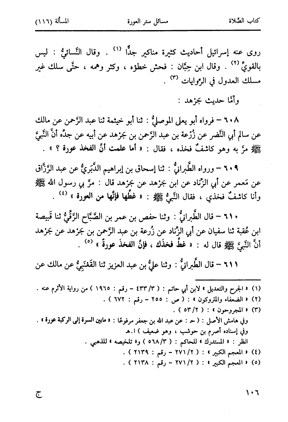 610 - قال الطَّبرانيُّ: وثنا حفص بن عمر بن الصَّبَّاح الرَّقِّيُّ ثنا قَبيصة ابن عُقبة ثنا سفيان عن أبي الزِّناد عن زُرعة بن عبد الرَّحمن بن جَرْهد عن جَرْهد أنَّ النَّبيَّ صَلَّى اللَّهُ عَلَيْهِ وَسَلَّمَ قال له: " غطِّ فخذَك، فإنَّ الفخذَ عورةٌ " (5).