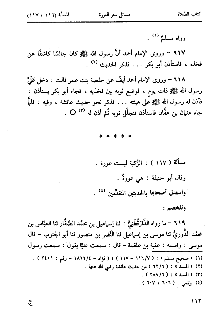 617 - وروى الإمام أحمد أنَّ رسول الله صَلَّى اللَّهُ عَلَيْهِ وَسَلَّمَ كان جالسًا كاشفًا عن فخذه، فأستأذن أبو بكر ... فذكر الحديث (2).