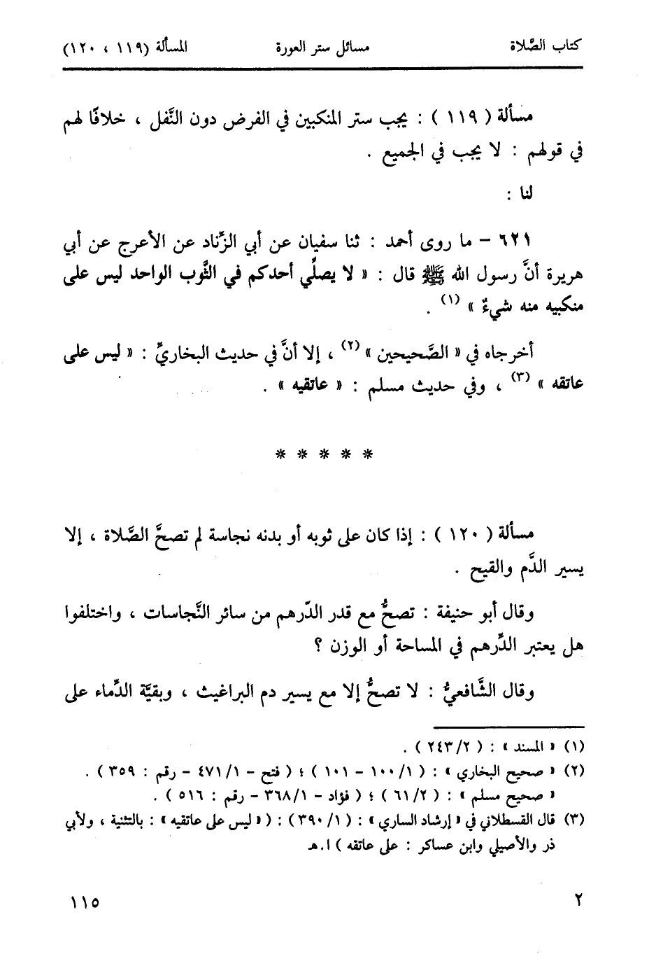 مسألة (119): يجب ستر المنكبين في الفرض دون النَّفل، خلافًا لهم في قولهم: لا يجب في الجميع.