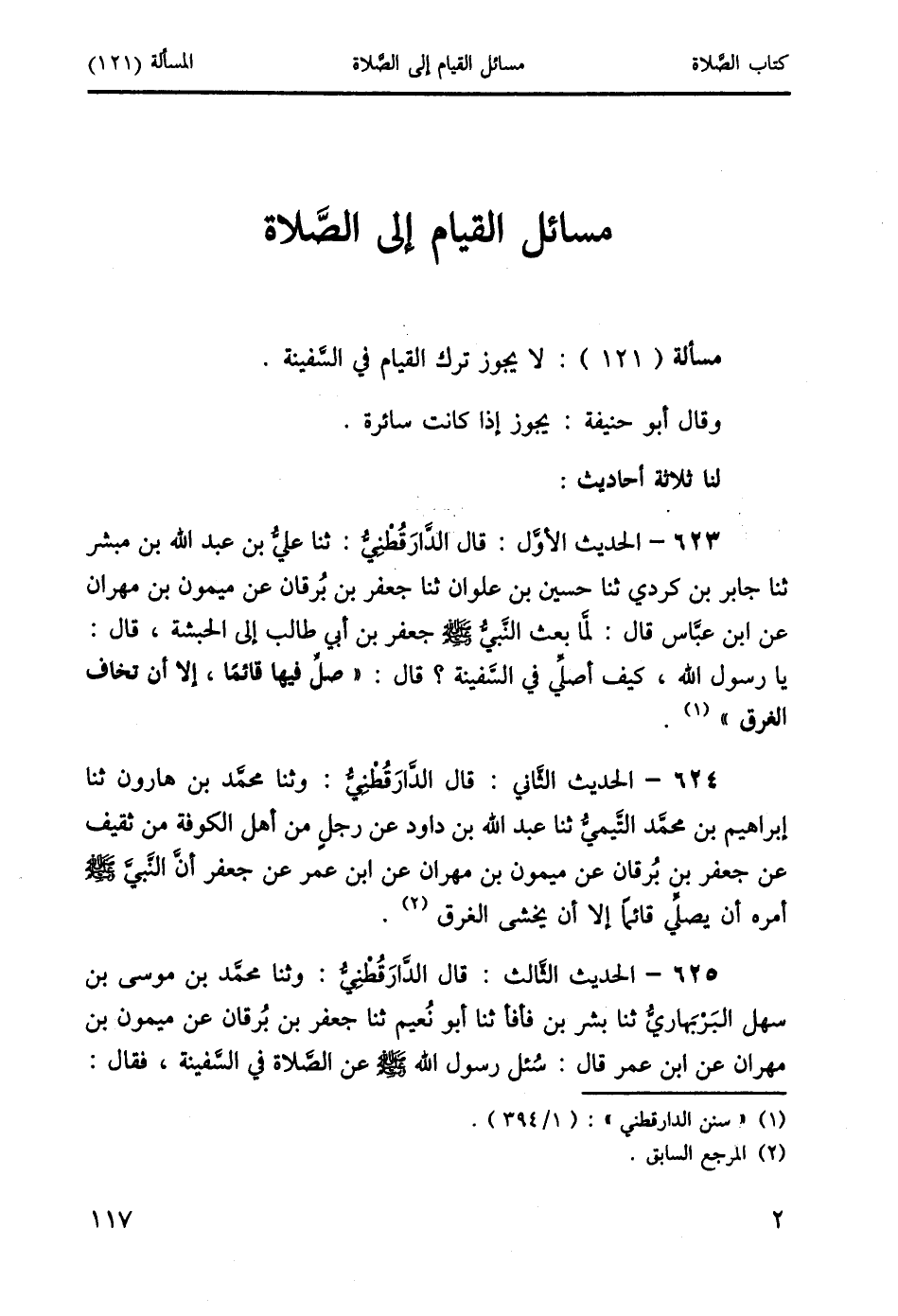 623 - الحديث الأوَّل: قال الدَّارَقُطْنِيُّ: ثنا عليُّ بن عبد الله بن مبشر ثنا جابر بن كردي ثنا حسين بن علوان ثنا جعفر بن بُرقان عن ميمون بن مهران عن ابن عباس قال: لمَّا بعث النَّبيُّ صَلَّى اللَّهُ عَلَيْهِ وَسَلَّمَ جعفر بن أبي طالب إلى الحبشة، قال: يا رسول الله، كيف أصلِّي في السَّفينة؟ قال: " صلِّ فيها قائمًا، إلا أن تخاف الغرق " (1).
