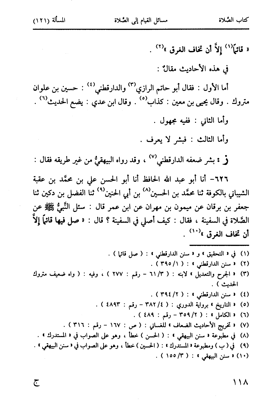 ز: بشر ضعفه الدَّارَقُطْنِيُّ (7)، وقد رواه البيهقيُّ من غير طريقه فقال: 626 - أنا أبو عبد الله الحافظ أنا أبو الحسن علي بن محمد بن عقبة الشيباني بالكوفة ثنا محمد بن الحسين (8) بن أبي الحنين (9) ثنا الفضل بن دكين ثنا جعفر بن برقان عن ميمون بن مهران عن ابن عمر قال: سئل النَّبيُّ صَلَّى اللَّهُ عَلَيْهِ وَسَلَّمَ عن الصَّلاة في السَّفينة، فقال: كيف أصلِّي في السَّفينة؟ قال: " صلِّ فيها قائماً إلاَّ أن تخاف الغرق " (10).