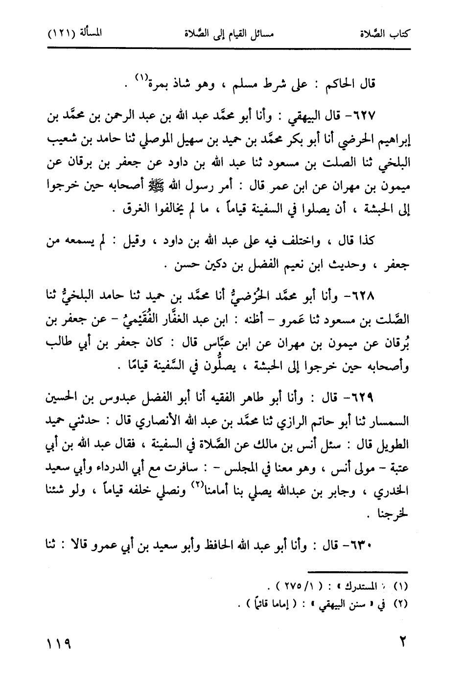 627 - قال البيهقيُّ: وأنا أبو محمد عبد الله بن عبد الرَّحمن بن محمد بن إبراهيم الحرضي أنا أبو بكر محمد بن حميد بن سهيل الموصلي ثنا حامد بن شعيب البلخي ثنا الصلت بن مسعود ثنا عبد الله بن داود عن جعفر بن برقان عن ميمون بن مهران عن ابن عمر قال: أمر رسول الله صَلَّى اللَّهُ عَلَيْهِ وَسَلَّمَ أصحابه حين خرجوا إلى الحبشة، أن يصلُّوا في السَّفينة قياماً، ما لم يخالفوا الغرق.