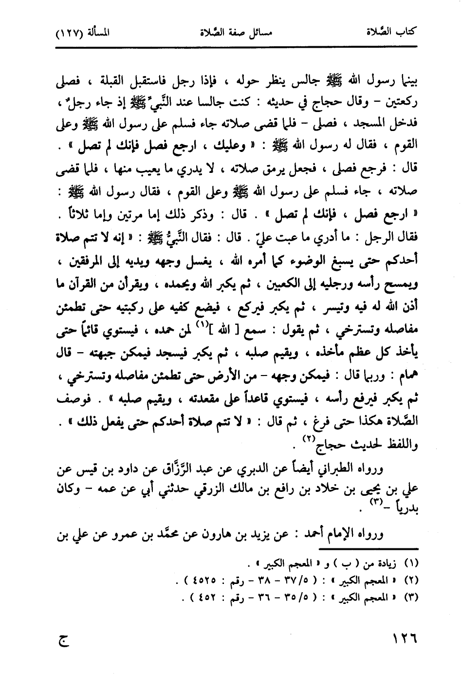 بينما رسول الله صَلَّى اللَّهُ عَلَيْهِ وَسَلَّمَ جالس ينظر حوله، فإذا رجل فاستقبل القبلة، فصلَّى ركعتين - وقال حجاج في حديثه: كنت جالسًا عند النَّبيِّ صَلَّى اللَّهُ عَلَيْهِ وَسَلَّمَ إذ جاء رجلٌ، فدخل المسجد، فصلَّى - فلما قضى صلاته جاء فسلم على رسول الله صَلَّى اللَّهُ عَلَيْهِ وَسَلَّمَ وعلى القوم، فقال له رسول الله صَلَّى اللَّهُ عَلَيْهِ وَسَلَّمَ: " وعليك، ارجع فصلِّ فإنك لم تصلِّ ".