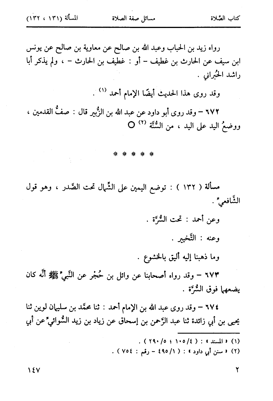 672 - وقد روى أبو داود عن عبد الله بن الزُّبير قال: صفُّ القدمين، ووضعُ اليد على اليد، من السُّنَّة (2) O.