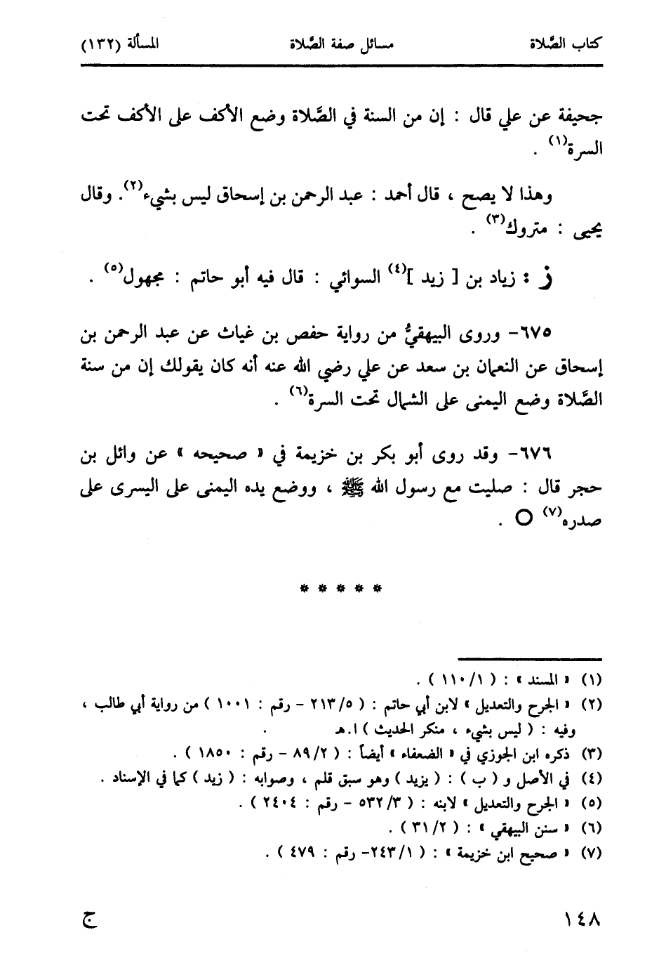 675 - وروى البيهقيُّ من رواية حفص بن غياث عن عبد الرَّحمن بن إسحاق عن النعمان بن سعد عن علي رضي الله عنه أنه كان يقول: إن من سنة الصَّلاة وضع اليمنى على الشمال تحت السرة (6).