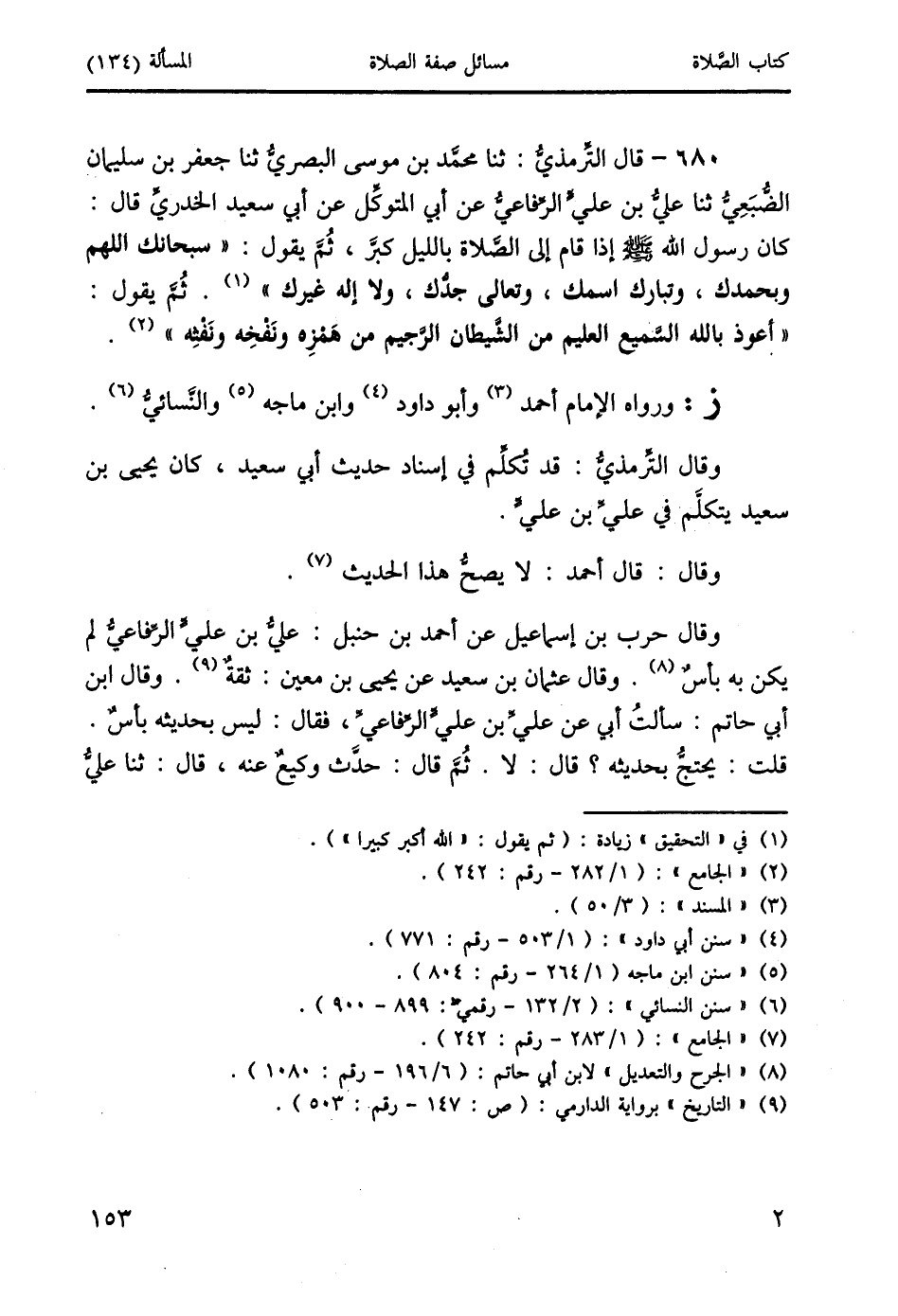 680 - قال التِّرمذيُّ: ثنا محمد بن موسى البصريُّ ثنا جعفر بن سليمان الضُّبَعِيُّ ثنا عليُّ بن عليٍّ الرِّفاعيُّ عن أبي المتوكِّل عن أبي سعيد الخدريِّ قال: كان رسول الله صَلَّى اللَّهُ عَلَيْهِ وَسَلَّمَ إذا قام إلى الصَّلاة بالليل كبَّر، ثمَّ يقول: " سبحانك اللهم وبحمدك، وتبارك اسمك، وتعالى جدُّك، ولا إله غيرك " (1). ثُمَّ يقول: " أعوذ بالله السَّميع العليم من الشَّيطان الرَّجيم من هَمْزِهِ ونَفْخِه ونَفْثِه " (2).