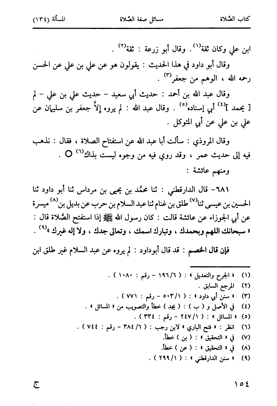 681 - قال الدَّارَقُطْنِيُّ: ثنا محمد بن يحيى بن مرداس ثنا أبو داود ثنا الحسين بن عيسى ثنا (7) طلق بن غنام ثنا عبد السلام بن حرب عن بديل بن (8) ميسرة عن أبي الجوزاء عن عائشة قالت: كان رسول الله صَلَّى اللَّهُ عَلَيْهِ وَسَلَّمَ إذا استفتح الصَّلاة قال: " سبحانك اللهم وبحمدك، وتبارك اسمك، وتعالى جدك، ولا إله غيرك " (9).