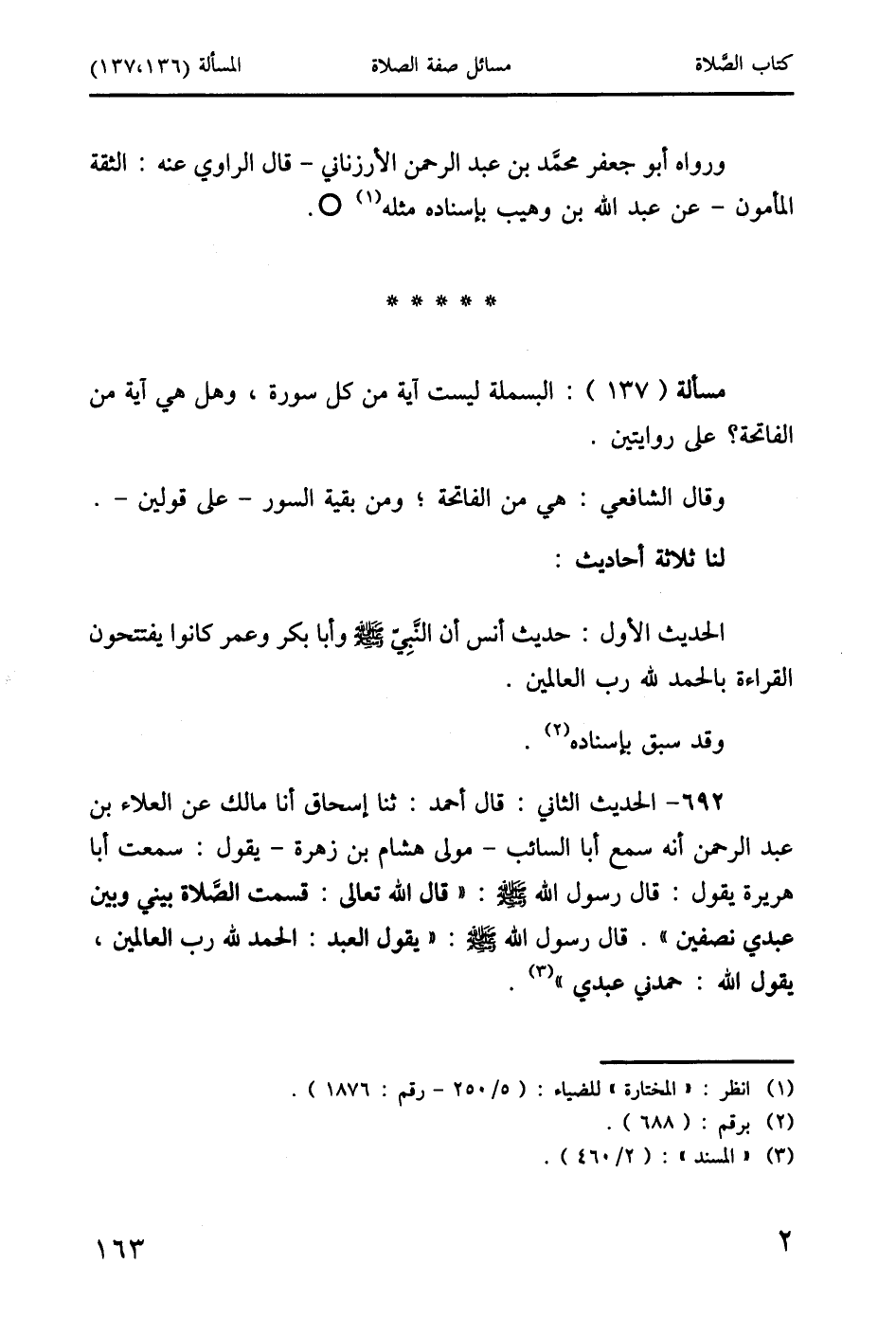 692 - الحديث الثَّاني: قال أحمد: ثنا إسحاق أنا مالك عن العلاء بن عبد الرَّحمن أنه سمع أبا السائب - مولى هشام بن زهرة - يقول: سمعت أبا هريرة يقول: قال رسول الله صَلَّى اللَّهُ عَلَيْهِ وَسَلَّمَ: " قال الله تعالى: قسمت الصَّلاة بيني وبين عبدي نصفين ". قال رسول الله صَلَّى اللَّهُ عَلَيْهِ وَسَلَّمَ: " يقول العبد: الحمد لله رب العالمين، يقول الله: حمدني عبدي " (3).
