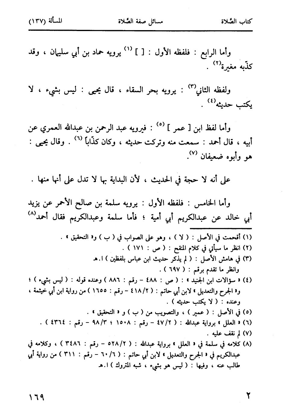 (8) كلامه في سلمة في "العلل" برواية عبد الله: (2/ 528 - رقم: 3486)، وكلامه في عبد الكريم في "الجرح والتعديل" لابن أبي حاتم: (6/ 60 - رقم: 311) من رواية أبي طالب عنه، وفيها: (ليس هو بشيء، شبه المتروك) ا. هـ