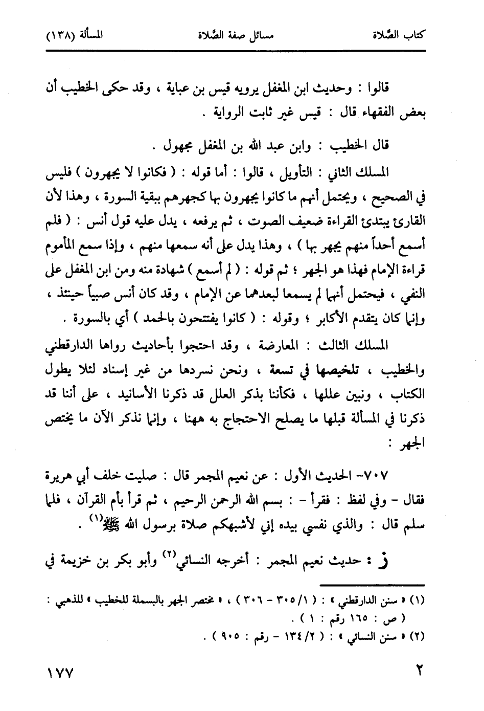المسلك الثالث: المعارضة، وقد احتجوا بأحاديث رواها الدَّارَقُطْنِيُّ والخطيب، تلخيصها في تسعة، ونحن نسردها من غير إسناد لئلا يطول الكتاب، ونبين عللها، فكأننا بذكر العلل قد ذكرنا الأسانيد، على أننا قد ذكرنا في المسألة قبلها ما يصلح الاحتجاج به ههنا، وإنما نذكر الآن ما يختص الجهر: 707 - الحديث الأوَّل: عن نعيم المجمر قال: صليت خلف أبي هريرة فقال - وفي لفظ: فقرأ -: بسم الله الرحمن الرحيم، ثم قرأ بأم القرآن، فلما سلم قال: والذي نفسي بيده إني لأشبهكم صلاة برسول الله صَلَّى اللَّهُ عَلَيْهِ وَسَلَّمَ (1).