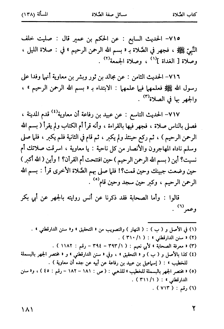717 - الحديث التاسع: عن عبيد بن رفاعة أن معاوية (4) قدم المدينة، فصلَّى بالناس صلاة، فجهر فيها بالقراءة، وأنه قرأ أم الكتاب ولم يقرأ (بسم الله الرحمن الرحيم)، ثم ركع حينئذ ولم يكبر، ثم قام في الثانية فلم يكبر، فلما صلَّى وسلم ناداه المهاجرون والأنصار من كل ناحية: يا معاوية، أسرقت صلاتك أم نسيت؟ أين (بسم الله الرحمن الرحيم) حين افتتحت أم القرآن؟! وأين (الله أكبر) حين وضعت جبينك وحين قمت؟! فلما صلَّى بهم الصَّلاة الأخرى قرأ: بسم الله الرحمن الرحيم، وكبَّر حين سجد وحين قام (5).