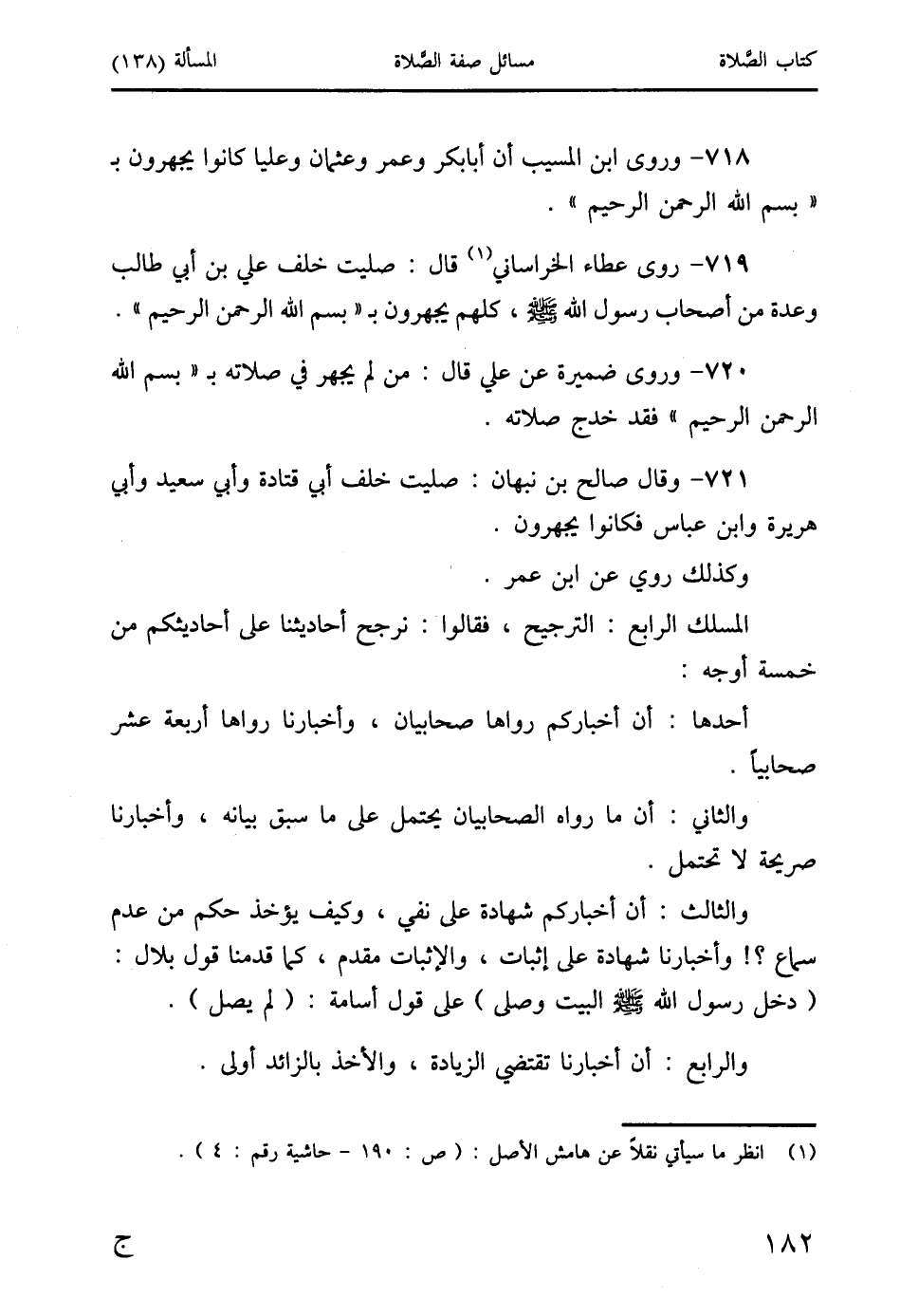 719 - روى عطاء الخراساني (1) قال: صلَّيت خلف علي بن أبي طالب وعدة من أصحاب رسول الله صَلَّى اللَّهُ عَلَيْهِ وَسَلَّمَ، كلهم يجهرون بـ "بسم الله الرحمن الرحيم".