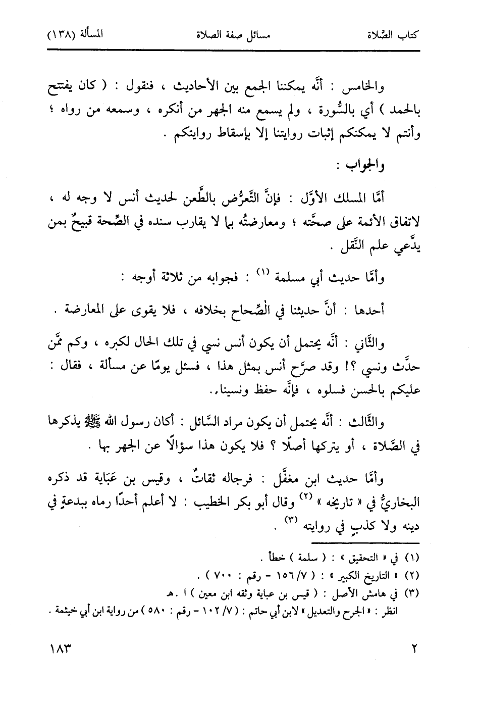 والثَّالث: أنَّه يحتمل أن يكون مراد السَّائل: أكان رسول الله صَلَّى اللَّهُ عَلَيْهِ وَسَلَّمَ يذكرها في الصَّلاة، أو يتركها أصلاً؟ فلا يكون هذا سؤالاً عن الجهر بها.