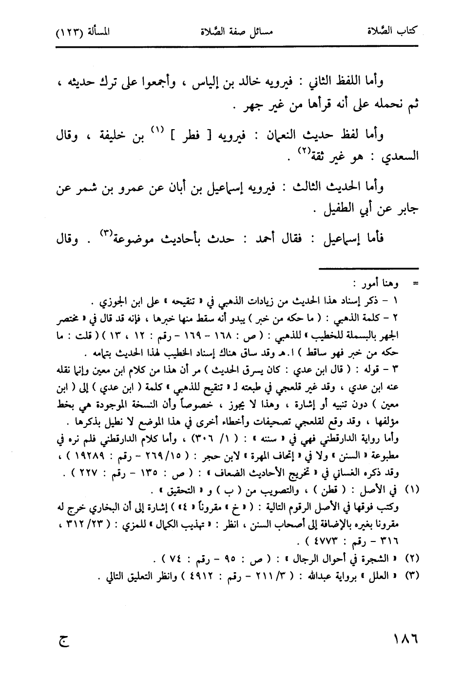 3 - قوله: (قال ابن عدي: كان يسرق الحديث) مر أن هذا من كلام ابن معين وإنما نقله عنه ابن عدي، وقد غير قلعجي في طبعته لـ "تنقيح الذهبي" كلمة (ابن عدي) إلى (ابن معين) دون تنبيه أو إشارة، وهذا لا يجوز، خصوصاً وأن النسخة الموجودة هي بخط مؤلفها، وقد وقع لقلعجي تصحيفات وأخطاء أخرى في هذا الموضع لا نطيل بذكرها.