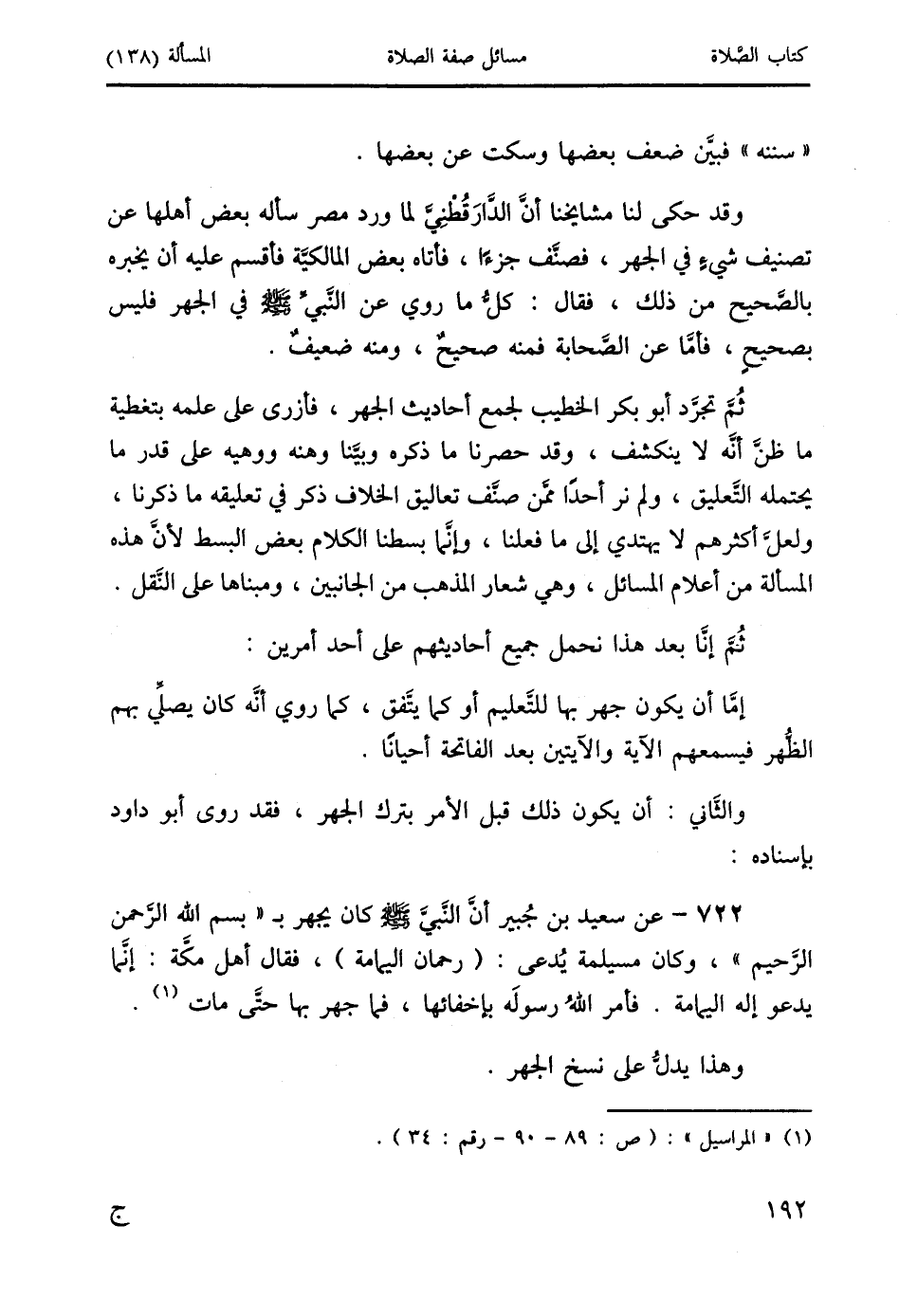 722 - عن سعيد بن جُبير أنَّ النَّبيَّ صَلَّى اللَّهُ عَلَيْهِ وَسَلَّمَ كان يجهر بـ " بسم الله الرحمن الرَّحيم "، وكان مسيلمة يُدعى: (رحمان اليمامة)، فقال أهل مكَّة: إنَّما يدعو إله اليمامة. فأمر اللهُ رسولَه بإخفائها، فما جهر بها حتى مات (1).