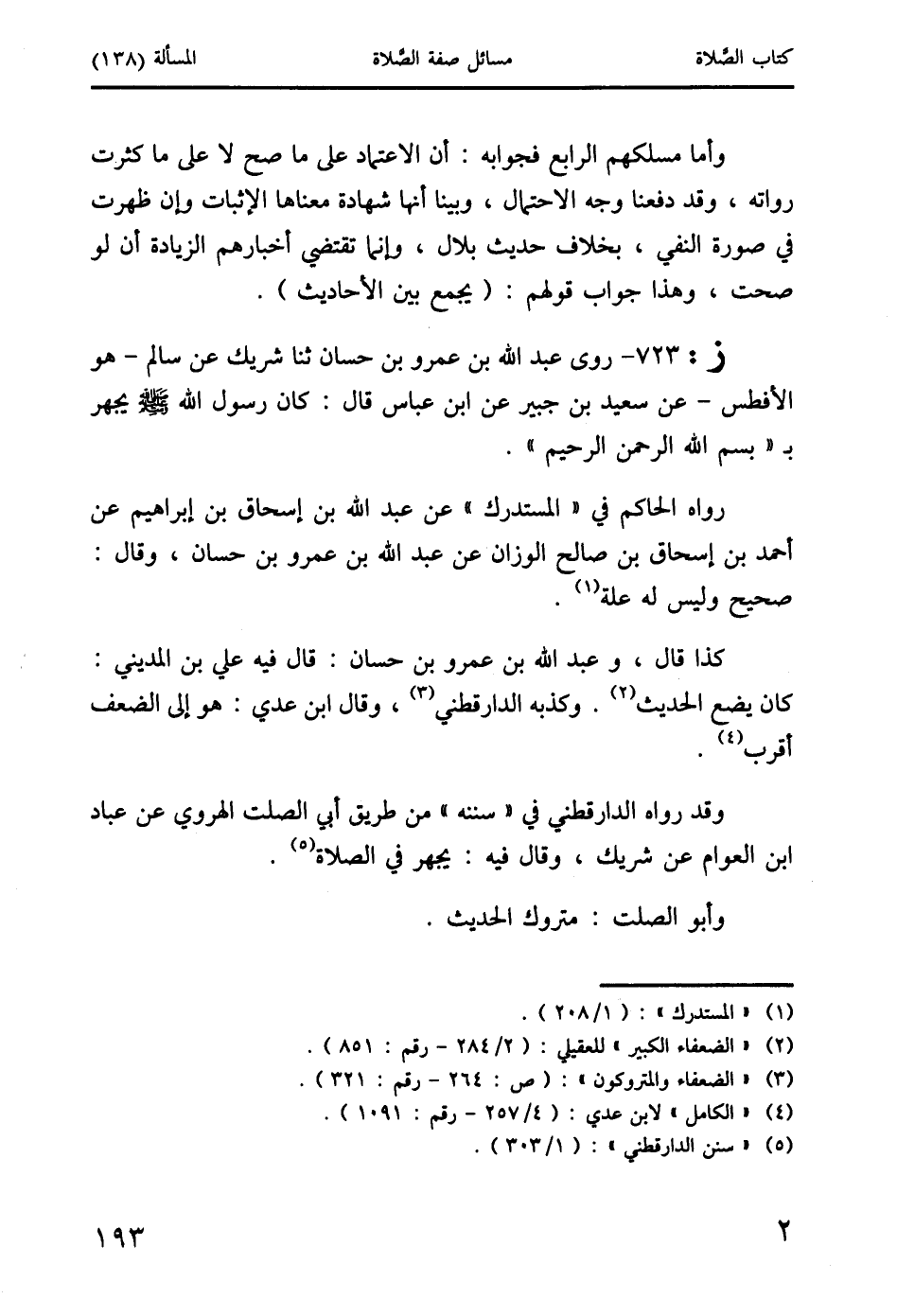 ز: 723 - روى عبد الله بن عمرو بن حسان ثنا شريك عن سالم - هو الأفطس - عن سعيد بن جبير عن ابن عباس قال: كان رسول الله صَلَّى اللَّهُ عَلَيْهِ وَسَلَّمَ يجهر بـ "بسم الله الرحمن الرحيم".