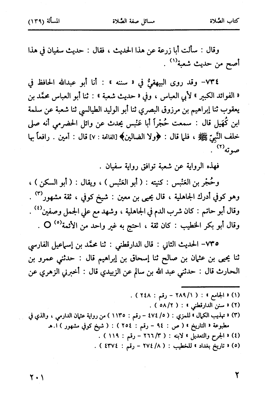 734 - وقد روى البيهقيُّ في "سننه": أنا أبو عبد الله الحافظ في " الفوائد الكبير " لأبي العباس، وفي " حديث شعبة ": ثنا أبو العباس محمد بن يعقوب ثنا إبراهيم بن مرزوق البصري ثنا أبو الوليد الطَّيالسيُّ ثنا شعبة عن سلمة ابن كُهَيل قال: سمعت حُجْراً أبا عَنْبس يحدث عن وائل الحضرمي أنه صلَّى خلف النَّبِيِّ صَلَّى اللَّهُ عَلَيْهِ وَسَلَّمَ، فلما قال:} وَلَا الضَّالِّينَ {[الفاتحة: 7] قال: آمين. رافعاً بها صوته (2).
