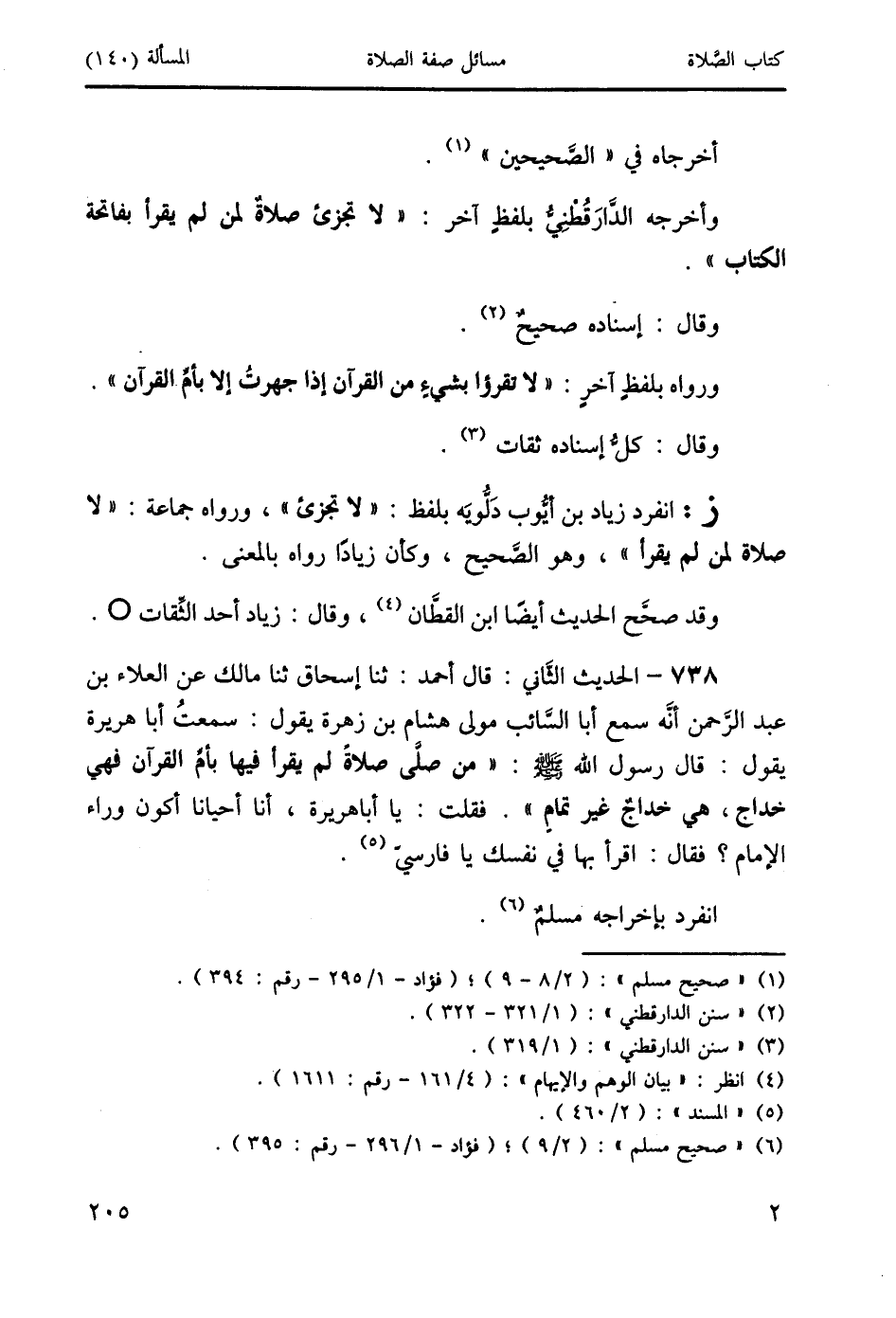 738 - الحديث الثَّاني: قال أحمد: ثنا إسحاق ثنا مالك عن العلاء بن عبد الرَّحمن أنَّه سمع أبا السَّائب مولى هشام بن زهرة يقول: سمعتُ أبا هريرة يقول: قال رسول الله صَلَّى اللَّهُ عَلَيْهِ وَسَلَّمَ: " من صلَّى صلاةً لم يقرأ فيها بأمِّ القرآن فهي خداج، هي خداجٌ غير تمامٍ ". فقلت: يا أبا هريرة، أنا أحيانًا أكون وراء الإمام؟ فقال: اقرأ بها في نفسك يا فارسيّ (5).