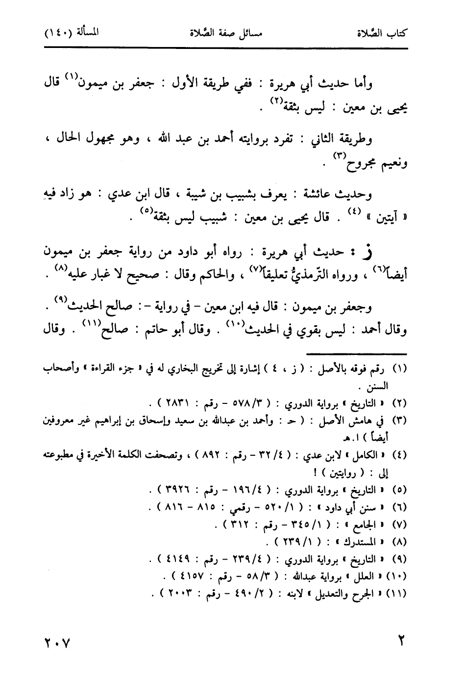 وأما حديث أبي هريرة: ففي طريقة الأول: جعفر بن ميمون (1) قال يحيى بن معين: ليس بثقة (2).