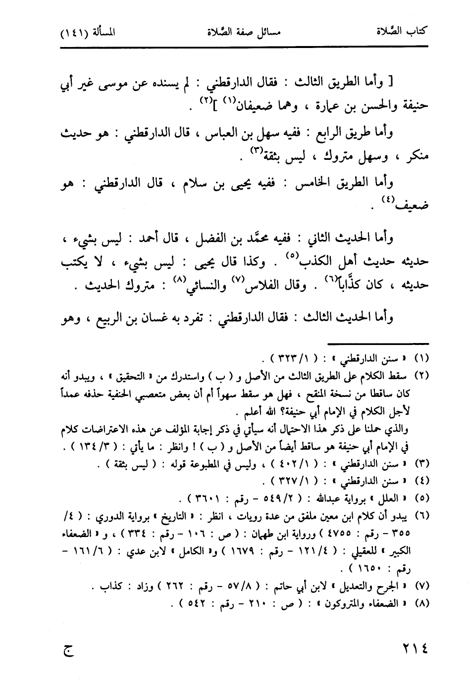 (2) سقط الكلام على الطريق الثالث من الأصل و (ب) واستدرك من "التحقيق"، ويبدو أنه كان ساقطاً من نسخة المنقح، فهل هو سقط سهواً أم أن بعض متعصبي الحنفية حذفه عمداً لأجل الكلام في الإمام أبي حنيفة؟ الله أعلم.