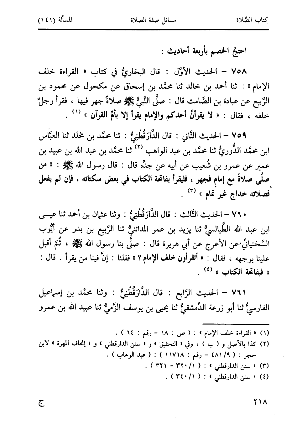 760 - الحديث الثَّالث: قال الدَّارَقُطْنِيُّ: وثنا عثمان بن أحمد ثنا عيسى ابن عبد الله الطَّيالسيُّ ثنا يزيد بن عمر المدائنيُّ ثنا الرَّبيع بن بدر عن أيُّوب السَّختيانيِّ عن الأعرج عن أبي هريرة قال: صلَّى بنا رسول الله صَلَّى اللَّهُ عَلَيْهِ وَسَلَّمَ، ثُمَّ أقبل علينا بوجهه، فقال: " أتقرأون خلف الإمام؟ " فقلنا: إنَّ فينا من يقرأ. قال: " فبفاتحة الكتاب " (4).