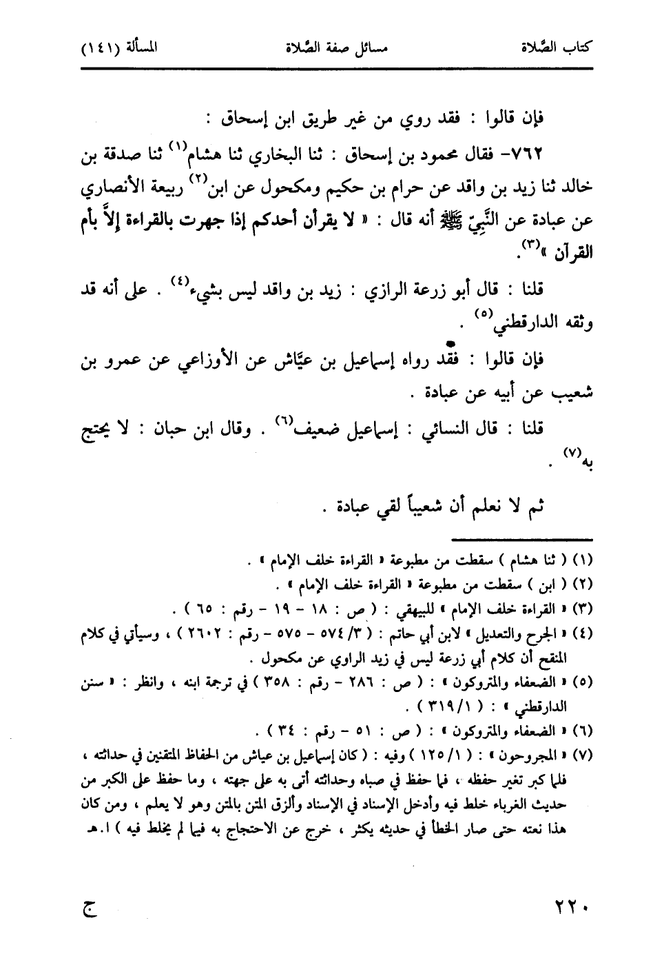 762 - فقال محمود بن إسحاق: ثنا البخاري ثنا هشام (1) ثنا صدقة بن خالد ثنا زيد بن واقد عن حرام بن حكيم ومكحول عن ابن (2) ربيعة الأنصاري عن عبادة عن النَّبِيِّ صَلَّى اللَّهُ عَلَيْهِ وَسَلَّمَ أنه قال: " لا يقرأن أحدكم إذا جهرت بالقراءة إلاَّ بأم القرآن " (3).